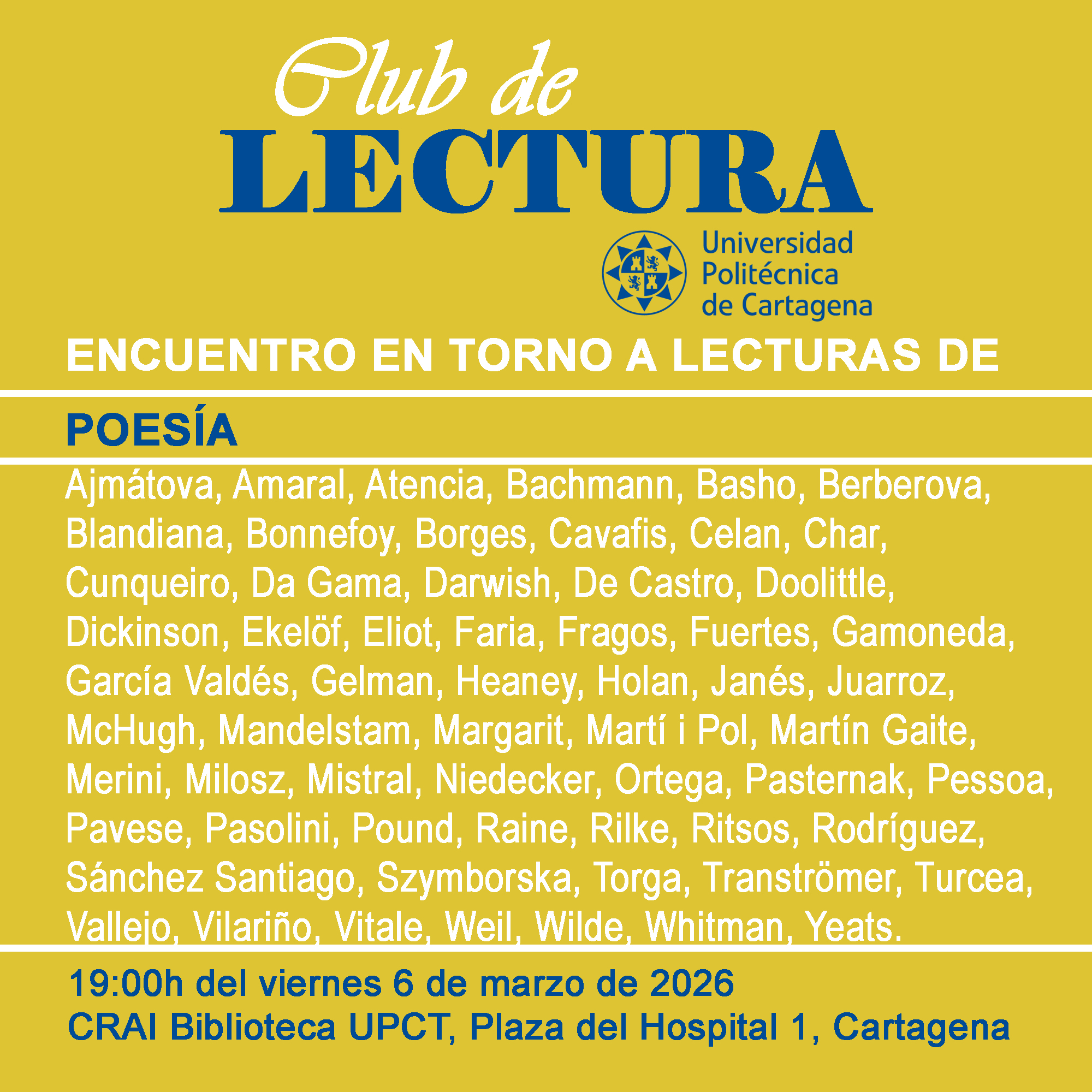 La próxima sesión del Club de Lectura de la UPCT se celebrará el viernes 6 de marzo a las 19:00 horas en la Sala 2 (Antigones) del CRAI Biblioteca. En esta ocasión, el encuentro estará dedicado al comentario y puesta en común de una selección de poemas elegidos por su coordinadora, Natalia Carbajosa.